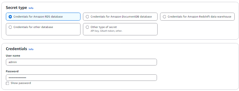 - Repeat the steps above to create a new secret for the RDS database.