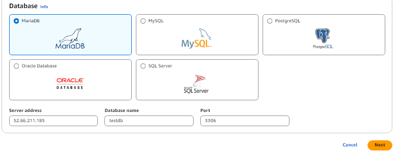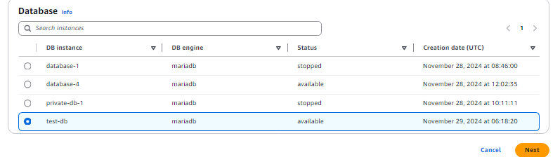 Verify that the correct RDS instance (MariaDB) is selected as the target.