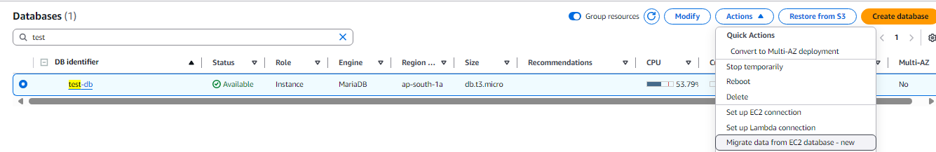 - Select your database and then I n the Actions dropdown menu, select "Migrate data from EC2 database"